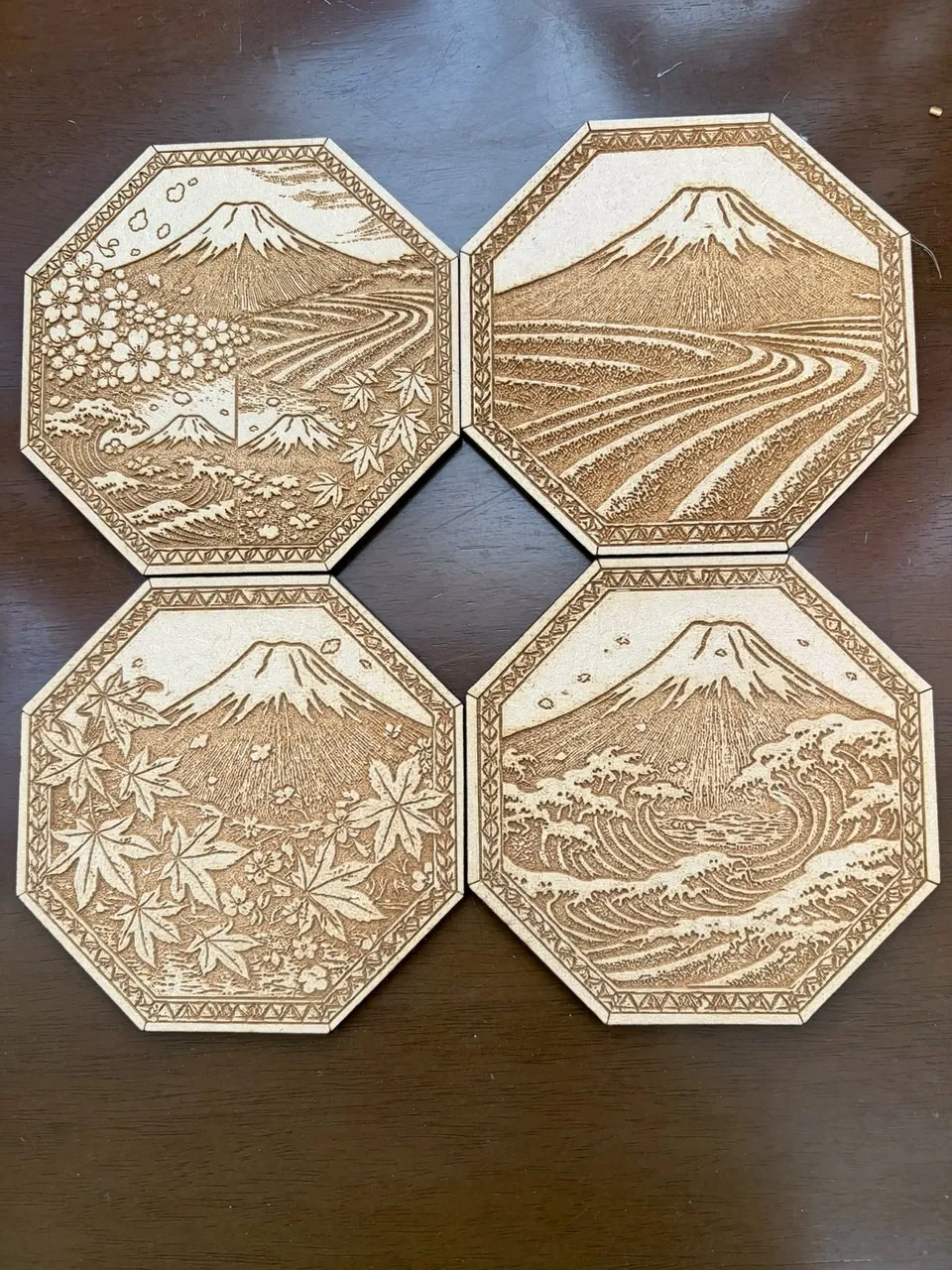 富士山の気を使ってエネルギー溢れる日本語の言霊が入ったカフと富士山の木を使って作成した富士山の春夏秋冬を表したコースター!